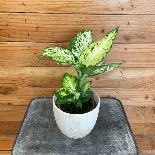 Dieffenbachia Amy is a unique houseplant that has large textured green foliage. Dieffenbachia is also referred to as dumbcane and is a staple for all houseplant collectors. These jungle lovers are native to central America and can tolerate a decent amount of shade!